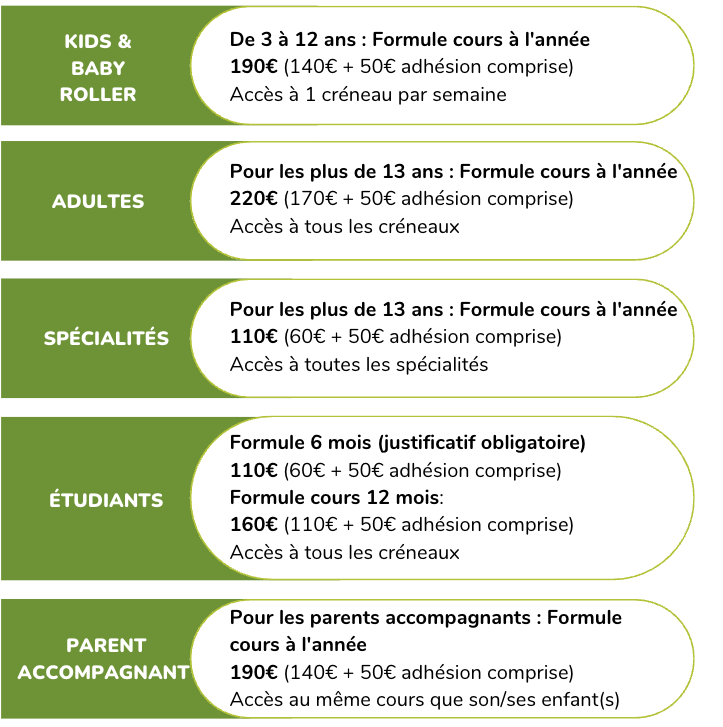 - Le quatrième avantage est que vous pouvez bénéficier des cours de roller en couplant l’adhésion à différentes formules que nous proposons. Tous nos cours sont consultables en détail ici, vous trouverez forcément une formule qui vous convient !